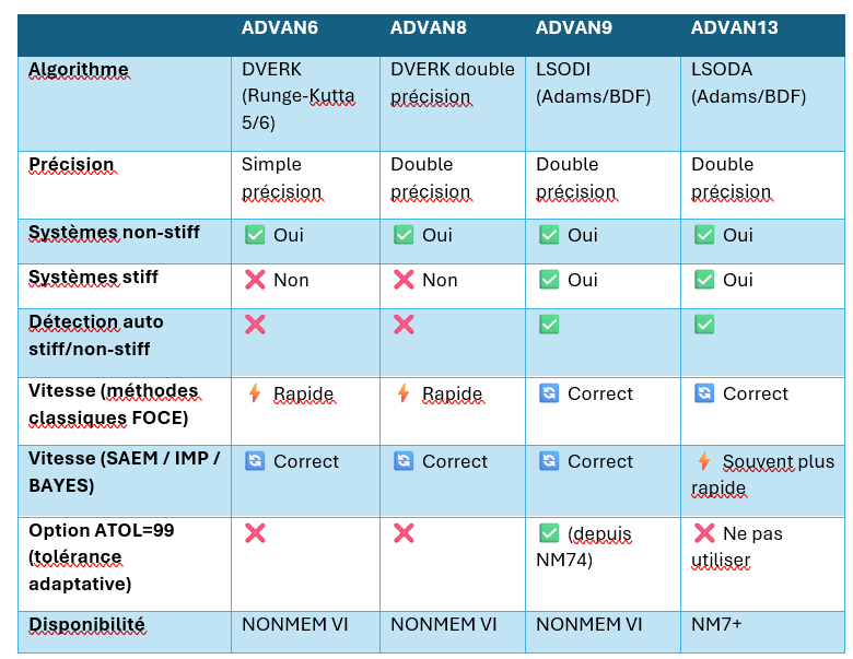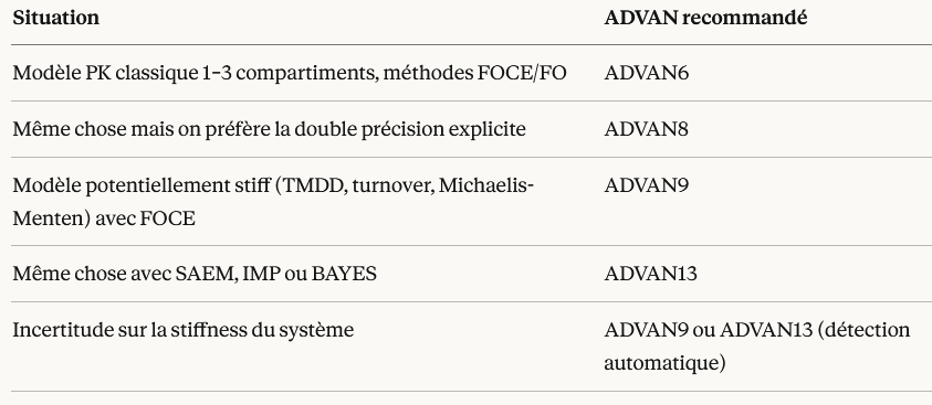 Il existe 4 ADVAN pour équations différentielles: ADVAN6, 8, 9 et 13.